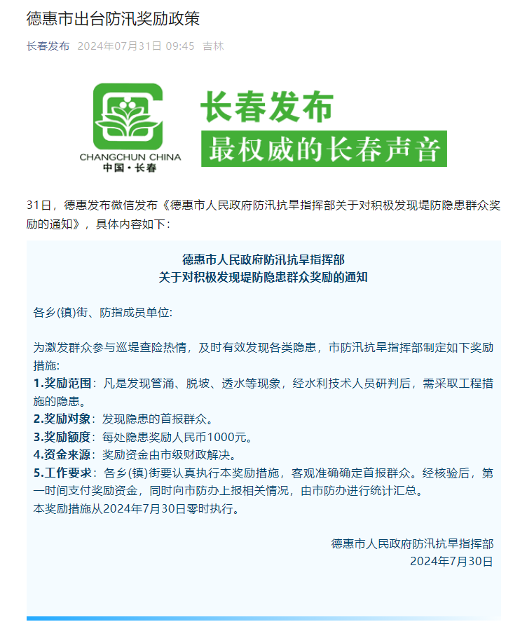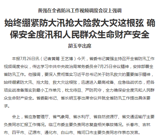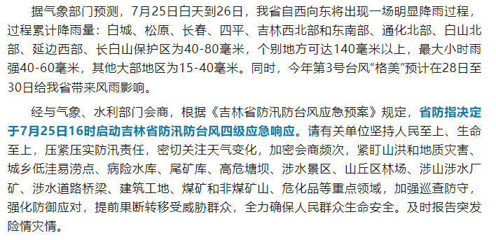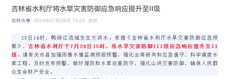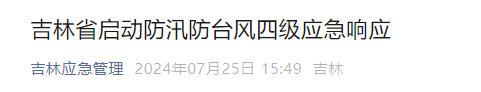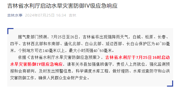 吉林省水利厅于7月25日16时启动水旱灾害防御IV级应急响应。