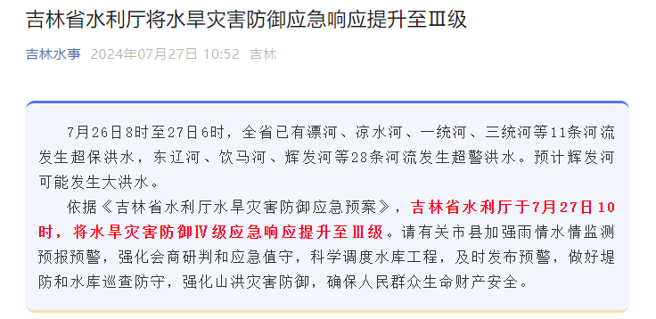 7月27日10时,吉林省水利厅将水旱灾害防御Ⅳ级应急响应提升至Ⅲ级。