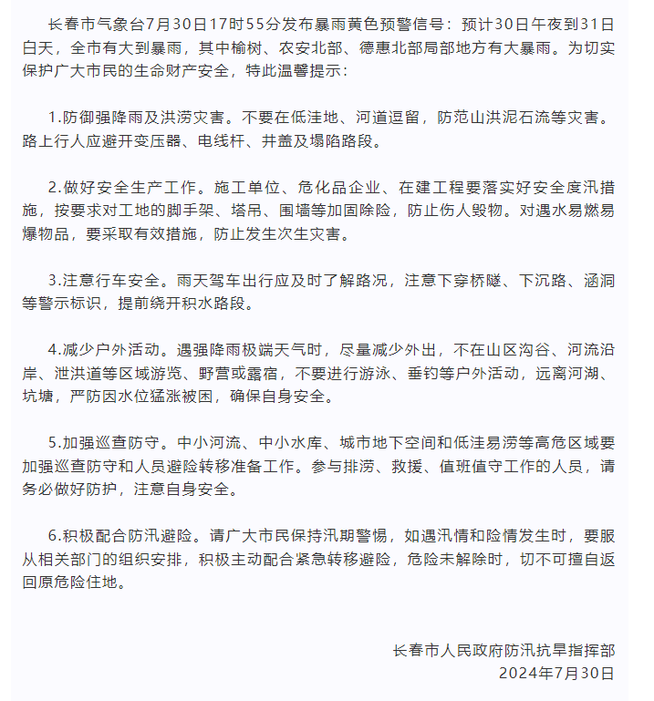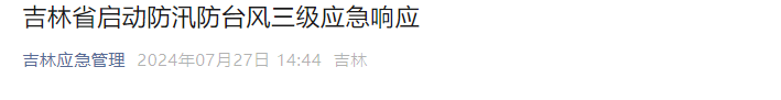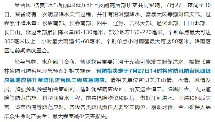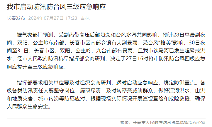 ——7月27日16时,长春市将市防汛防台风四级应急响应提升至三级应急响应。