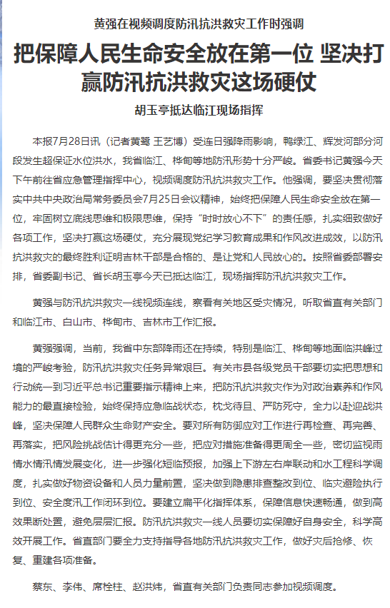 7月28日,受连日强降雨影响,鸭绿江、辉发河部分河段发生超保证水位洪水,我省临江、桦甸等地防汛形势十分严峻。省委书记黄强前往省应急管理指挥中心,视频调度防汛抗洪救灾工作。
