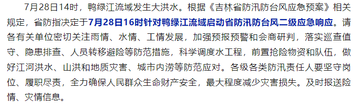 7月28日16时,省防指决定针对鸭绿江流域启动省防汛防台风二级应急响应。