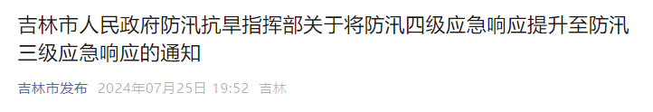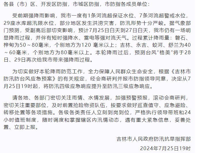 ——7月25日19时起,吉林市人民政府防汛抗旱指挥部将防汛四级应急响应提升至防汛三级应急响应。