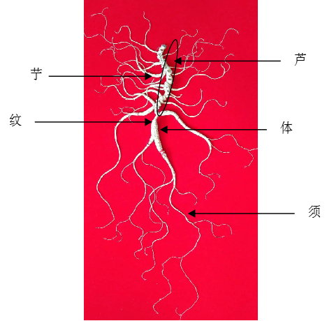 芦:人参主根上部的根茎,主要分为圆芦、堆花芦、马牙芦、缩脖芦、竹节芦等。