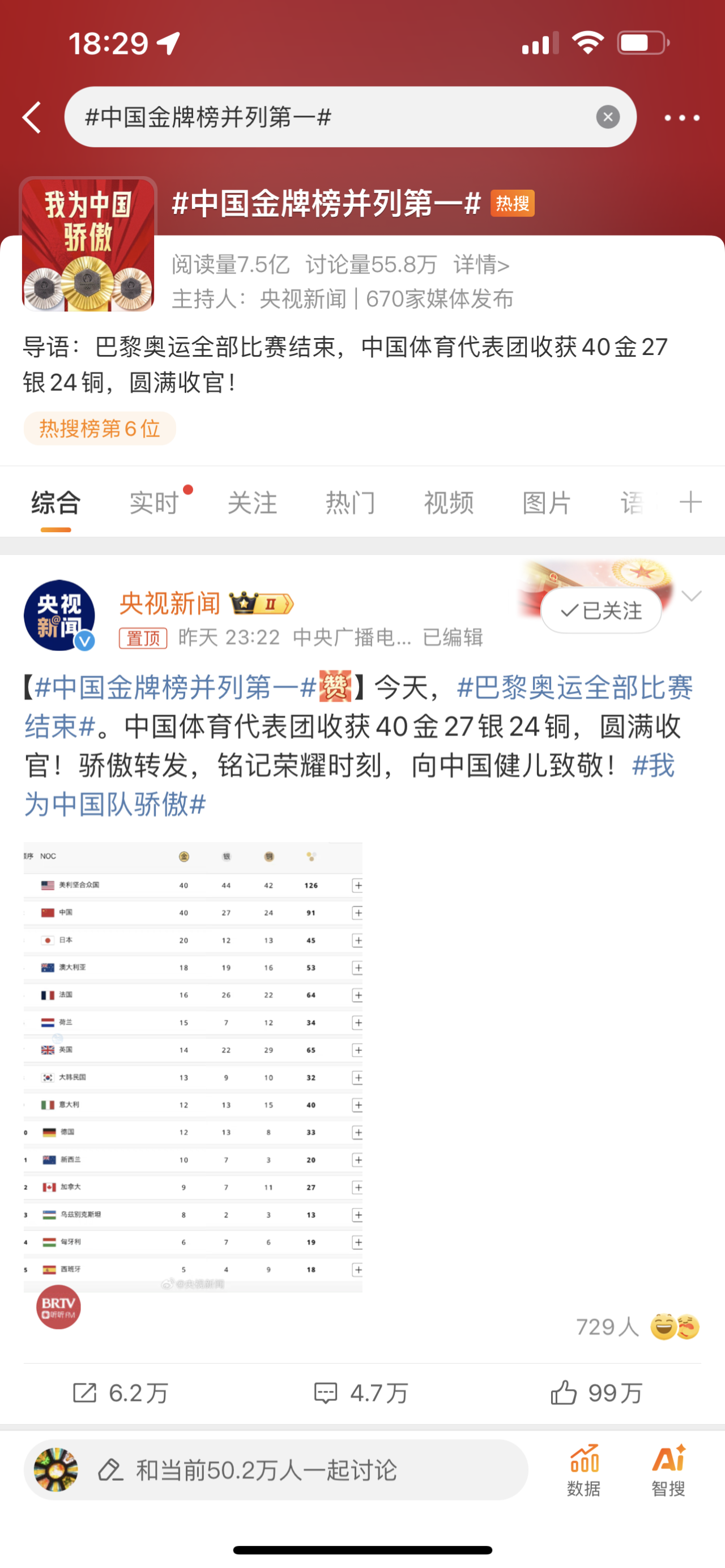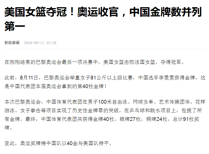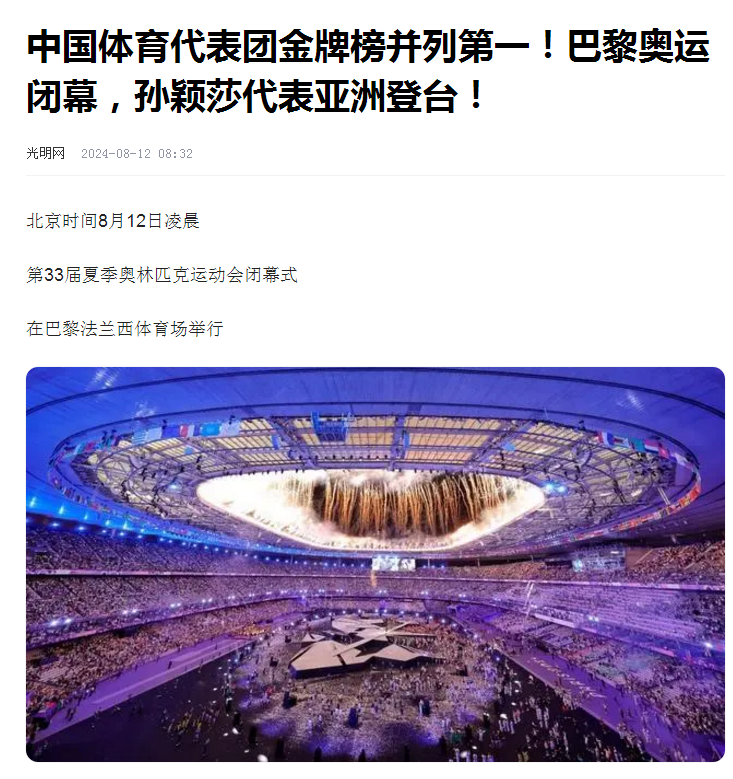 今天凌晨,万众瞩目的巴黎奥运会结束了。本届奥运会,中国体育代表团收获40金27银24铜,总计91枚奖牌。其中金牌数和美国持平,创造了中国境外参加奥运会的最佳成绩。
