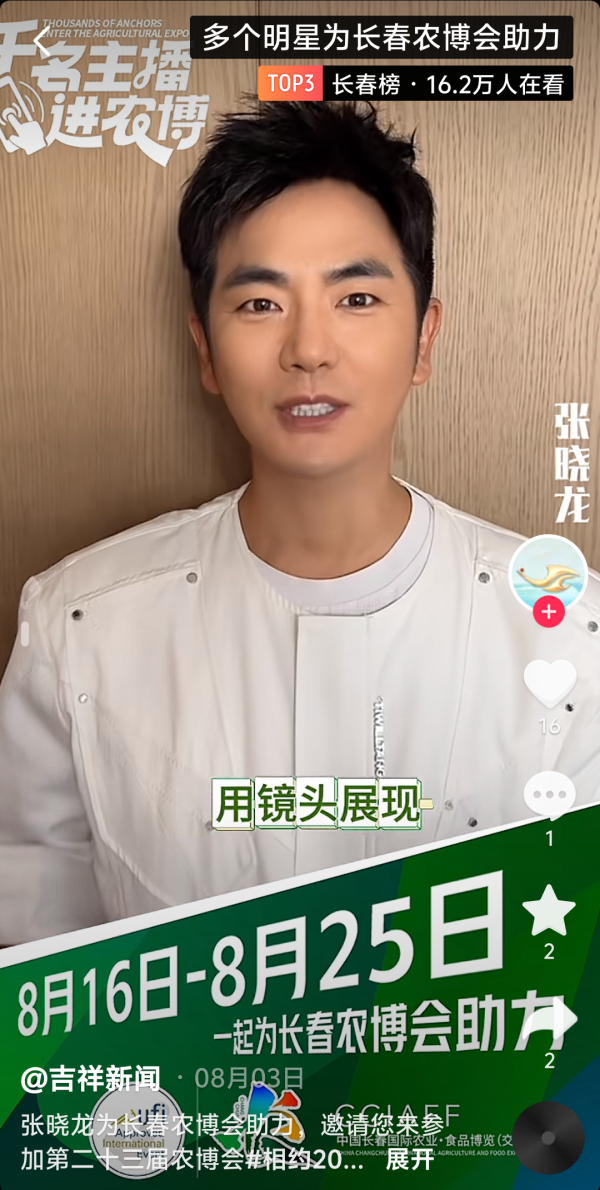 在本地方面,第二十三届中国长春国际农业·食品博览(交易)会就要开幕了。这不,有不少明星为本次农博会录制视频,为其加油助力。
