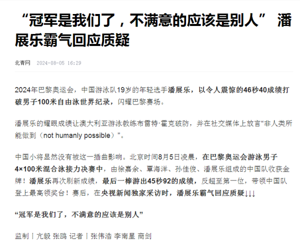在潘展乐拿到100米自由泳冠军后,就一度面临着各种质疑。4X100米混合泳再度夺冠之后,潘展乐在接受央视新闻独家采访时,霸气回应:“冠军是我们了,不满意的应该是别人”。