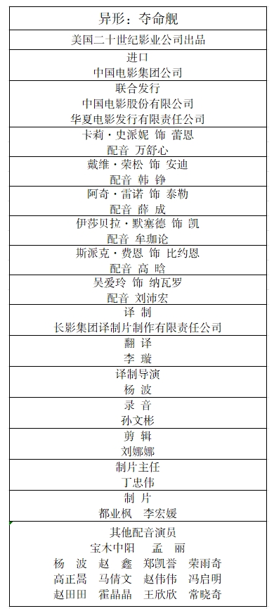 由费德·阿尔瓦雷兹执导并编剧,卡莉·史派妮、伊莎贝拉·默塞德等主演的异形系列新电影《异形:夺命舰》将于8月16日全国影院上映,该片中文版由长影译制片厂配译完成。