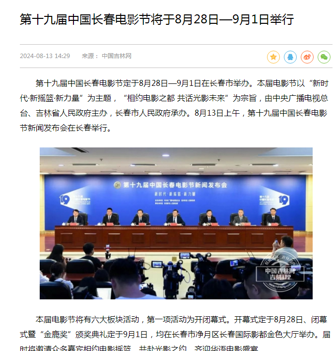 其他方面,据报道,第十九届中国长春电影节将于8月28日—9月1日举行。本届电影节以“新时代·新摇篮·新力量”为主题,“相约电影之都 共话光影未来”为宗旨,由中央广播电视总台、吉林省人民政府主办,长春市人民政府承办。8月13日上午,第十九届中国长春电影节新闻发布会在长春举行。