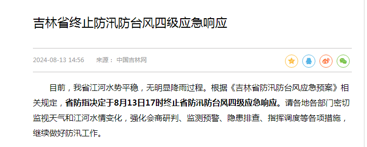 吉林省终止防汛防台风四级应急响应。目前,我省江河水势平稳,无明显降雨过程。根据《吉林省防汛防台风应急预案》相关规定,省防指决定于8月13日17时终止省防汛防台风四级应急响应。