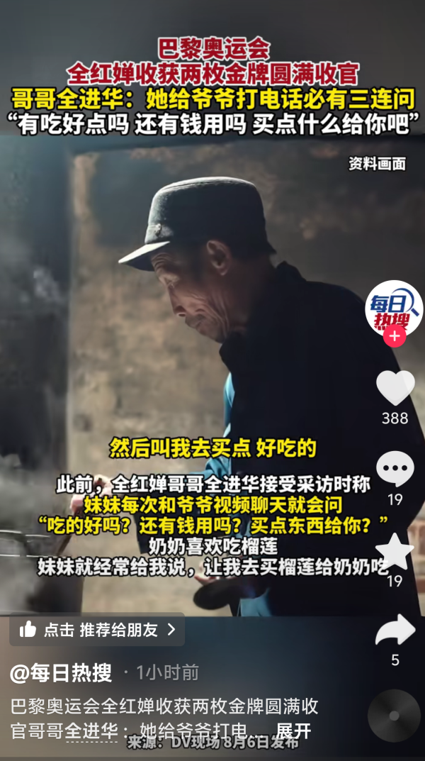 同时,关于全红婵每次给爷爷打电话,问候爷爷的话题,也冲上热搜。