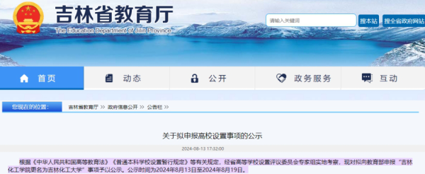 目前,“吉林化工学院更名为吉林化工大学”事项予以公示,公示时间为2024年8月13日至2024年8月19日。