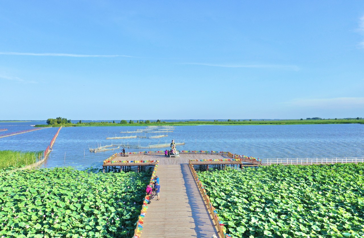 向西望,平原无垠、草甸成片、河湖连通、鹤舞长空,冰湖现腾鱼