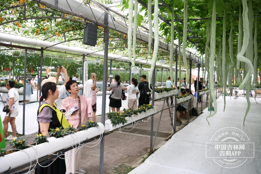 在无土栽培展区,参观者驻足观看蛇瓜树