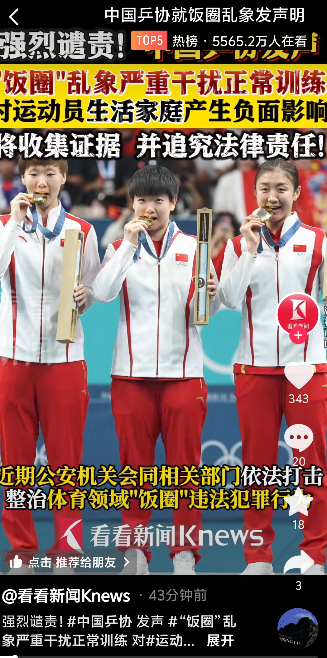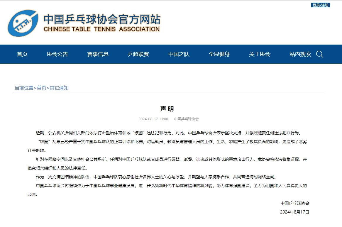 近期,公安机关会同相关部门依法打击整治体育领域“饭圈”违法犯罪行为。对此,中国乒乓球协会表示坚决支持,并强烈谴责任何违法犯罪行为。