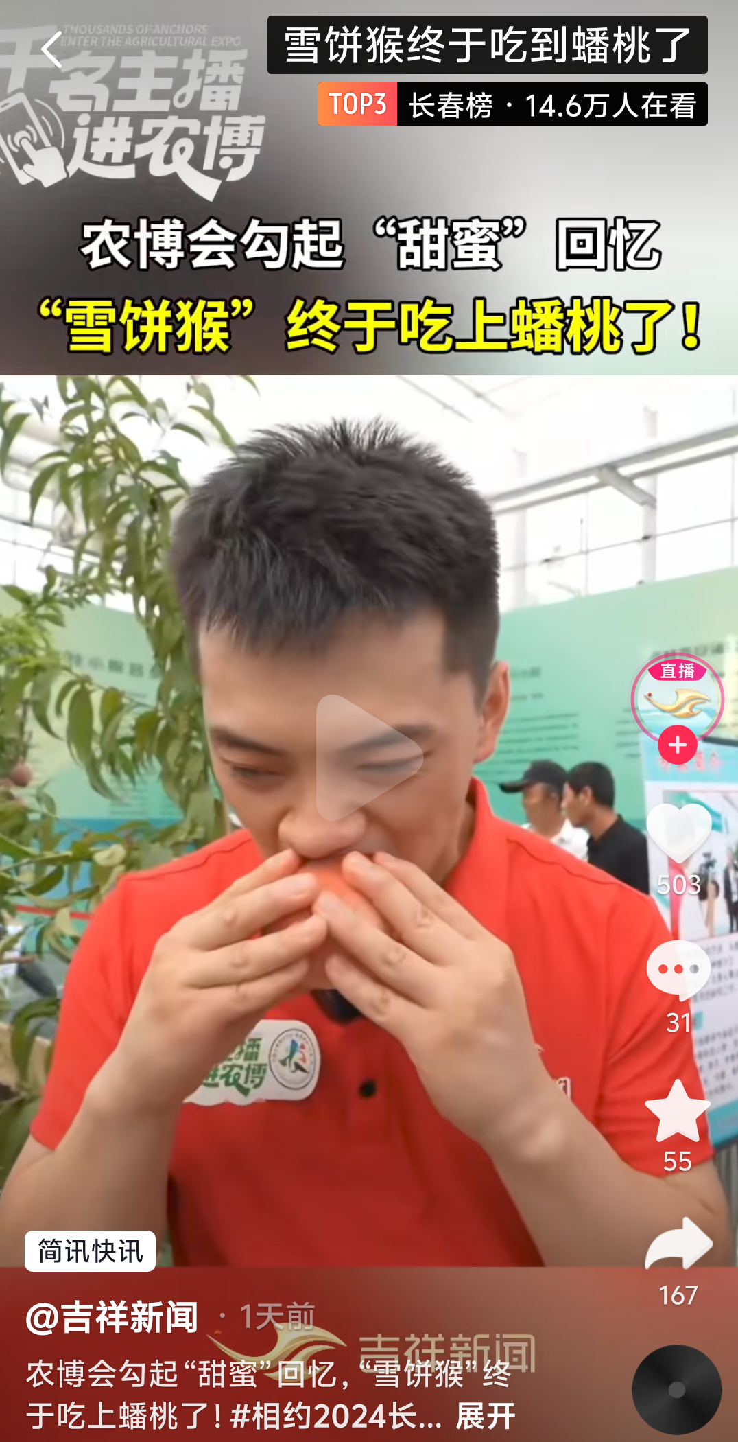有不少明星和网红,都在为长春农博会助力。这不,雪饼猴王铁柱吃到蟠桃的视频火了。