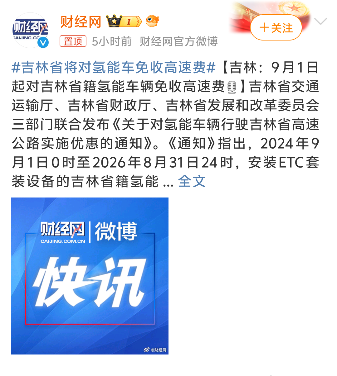 根据报道,吉林省交通运输厅、吉林省财政厅、吉林省发展和改革委员会三部门联合发布《关于对氢能车辆行驶吉林省高速公路实施优惠的通知》。《通知》指出,2024年9月1日0时至2026年8月31日24时,安装ETC套装设备的吉林省籍氢能车辆,在吉林省各高速公路收费站间点对点免费通行,相应的高速公路通行费由省财政统一支付。