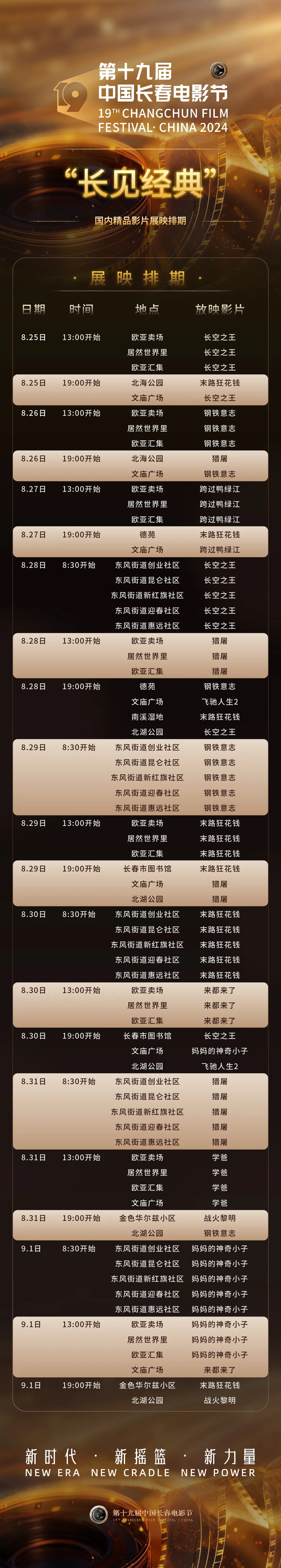 第十九届中国长春电影节即将于8月28日开幕。电影节期间,将举行“长见经典”国内精品影片展映活动,诸多优秀影片将在电影节期间上映,邀请热爱电影的你,共赴光影之约!