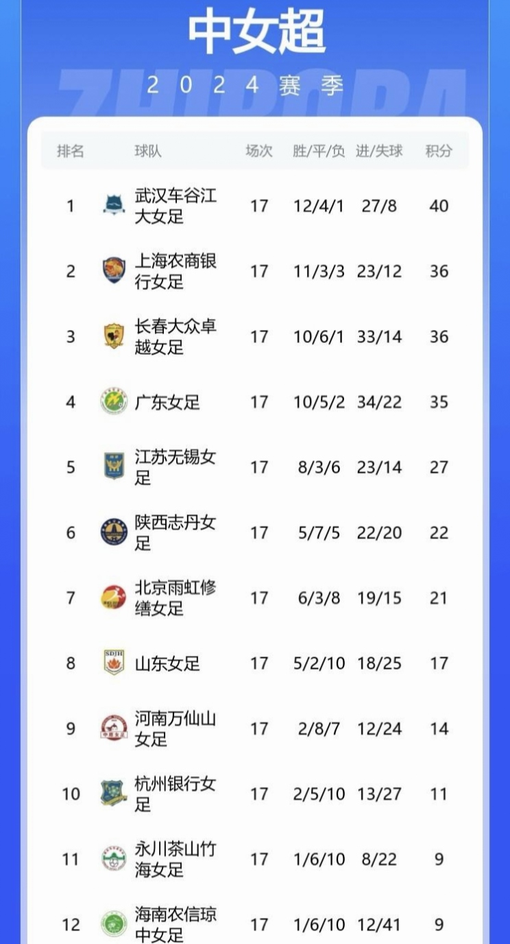 截至目前,女超联赛战罢17轮,武汉女足积40分暂列第一,上海女足、长春女足同积36分,分列二、三位。
