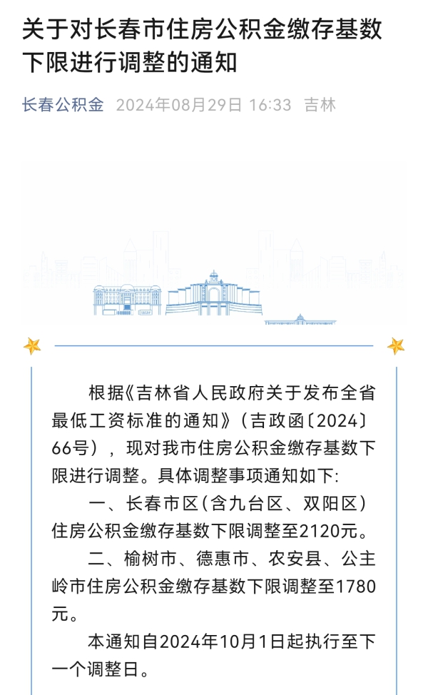 根据《吉林省人民政府关于发布全省最低工资标准的通知》(吉政函〔2024〕66号),对长春市住房公积金缴存基数下限进行调整。
