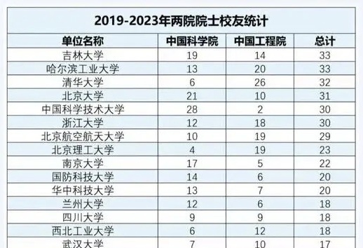 吉林大学中科院院士19人,工程院院士14人,总计培养院士33人,与哈尔滨工业大学并列冠军,清华大学以培养院士32人排在第三,北京大学以培养院士31人排在第四。