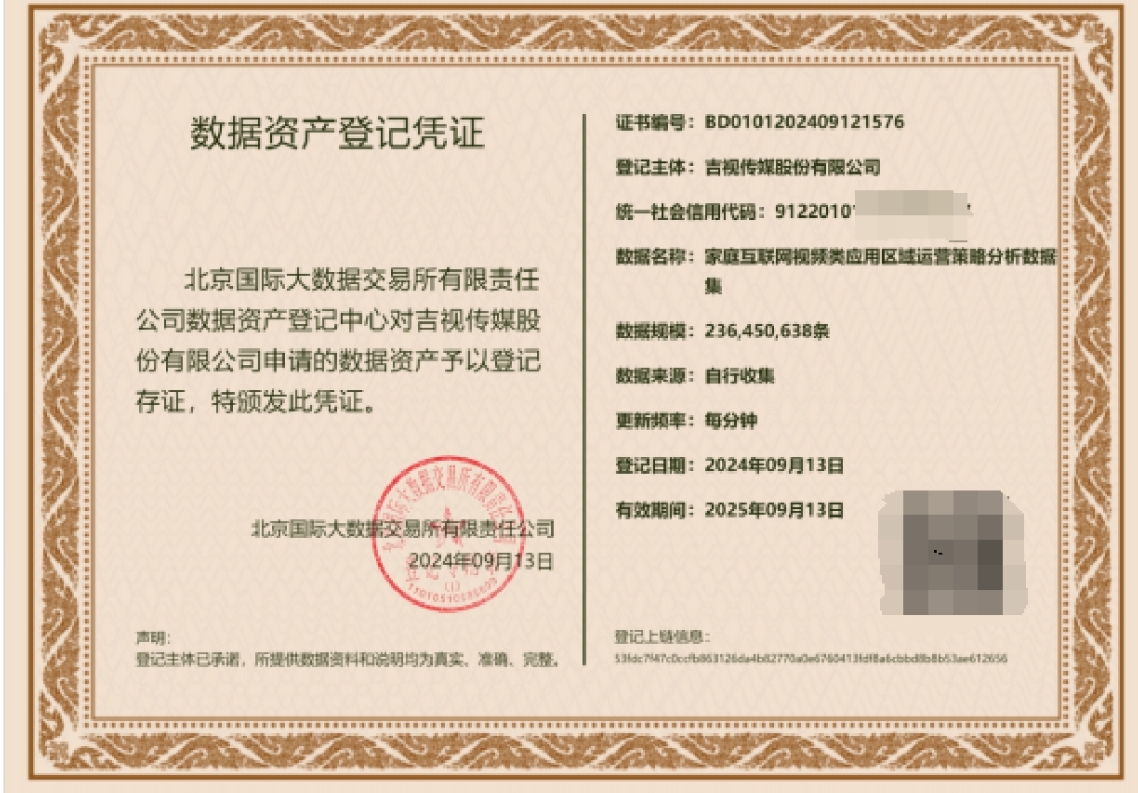 9月13日,吉视传媒设计的“家庭互联网视频类应用区域运营策略分析数据集”在北京国际大数据交易所成功登记获得相应的《数据资产登记证书》,率先实现全国广电领域首个家庭互联网视频类数据资产入表案例。
