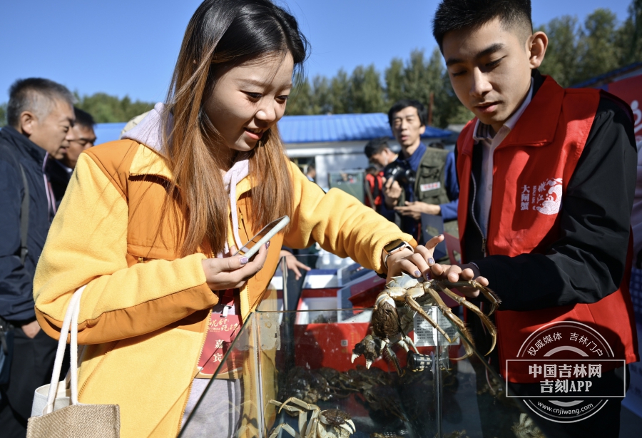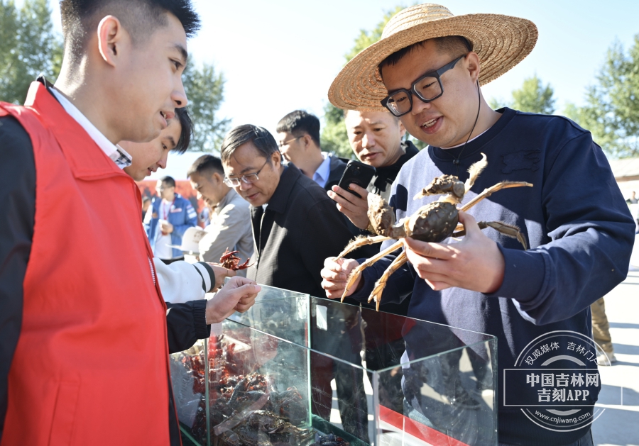 采访团成员被现场展示的成年人巴掌大小的大闸蟹吸引