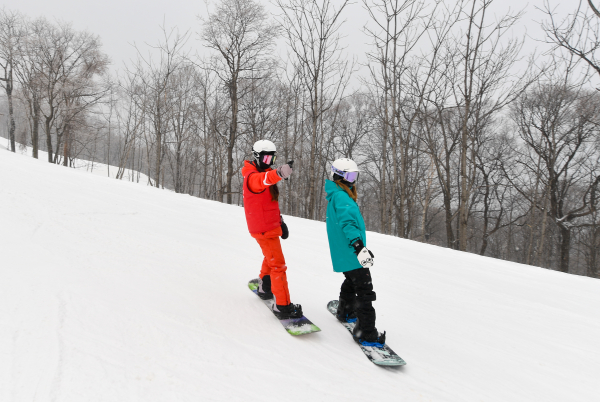 滑雪教练王雪(左)在北大湖滑雪度假区教学员滑雪。新华社