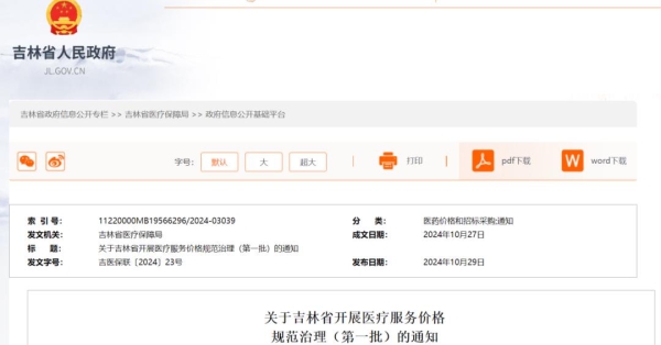 10月29日,吉林省人民政府网站发布《关于吉林省开展医疗服务价格规范治理(第一批)的通知》,规范治理4项医疗服务价格项目,11月11日起同步执行。具体内容如下: