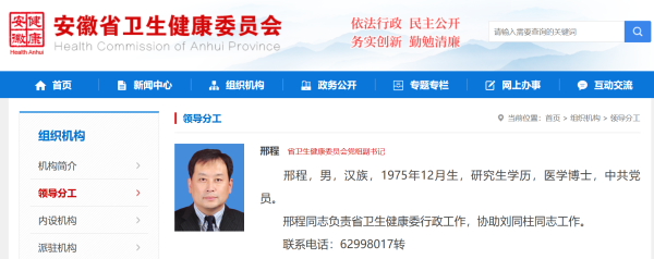 近日,安徽省卫健委官网“领导分工”栏目更新信息显示,邢程已任安徽省卫生健康委员会党组副书记,负责省卫健委行政工作,协助安徽省卫健委党组书记刘同柱同志工作。