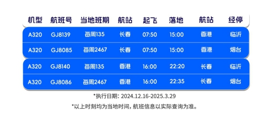 11月21日,中国吉林网从长龙航空获悉,2024年12月16日起,长龙航空将新开两条长春飞往香港航线。