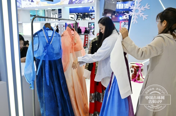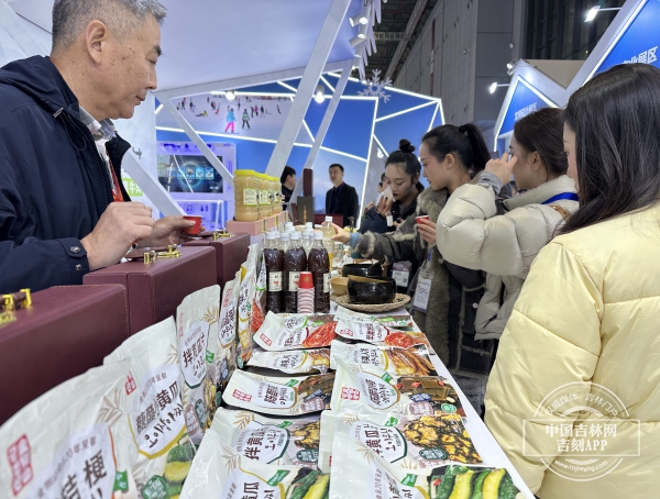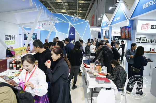 在展区中间位置设有集市,各类特色产品琳琅满目。现场可以看到不少人围在售卖延边朝鲜族非遗食品、饰品以及长白山特色产品的摊位前,好奇地询问、挑选着。