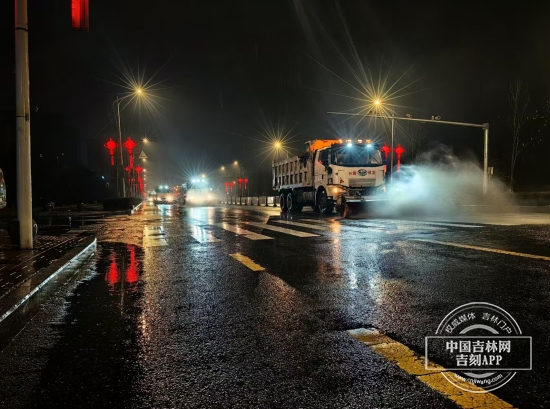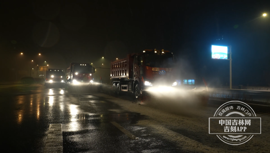 26日凌晨1时路面出现积水,所有清雪机械按各自作业路线编组开始循环打水作业,减少路面积水,防止结冰;