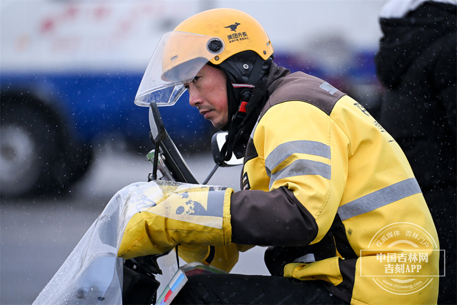 外卖小哥顶风冒雪穿梭在城市的街头巷尾