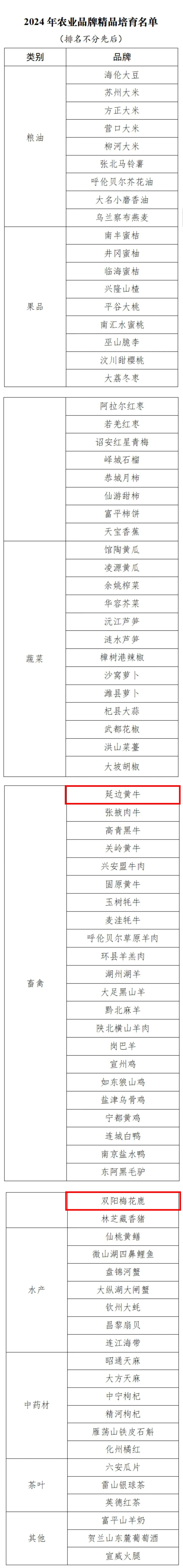 中国吉林网获悉,11月28日,在第二十一届中国国际农产品交易会上,2024年农业品牌精品培育计划名单正式发布,培育计划品牌总数达226个,吉林省延边黄牛和双阳梅花鹿2个畜牧品牌入选。