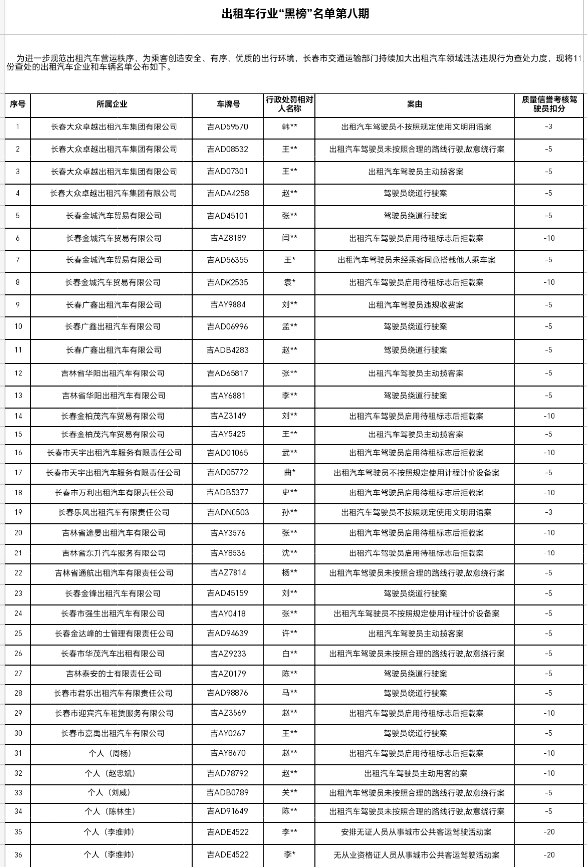 为进一步规范出租汽车营运秩序,为乘客创造安全、有序、优质的出行环境,长春市交通运输部门持续加大出租汽车领域违法违规行为查处力度,现将11月份查处的出租汽车企业和车辆名单公布如下。
