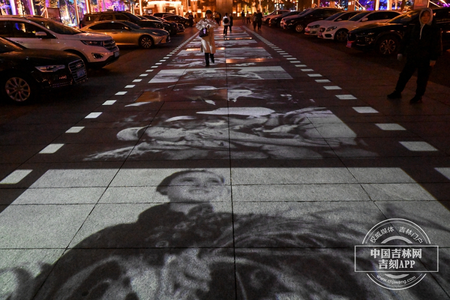激光投影机在地面上打出黑白相间的剧照图片,步入其中,仿佛进入了时光隧道