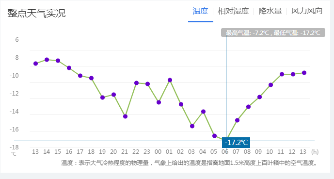 今天6时,长春市室外气温-17.2℃,就是到了一天中相对气温较高的13时,室外气温也仅有-8.8℃。