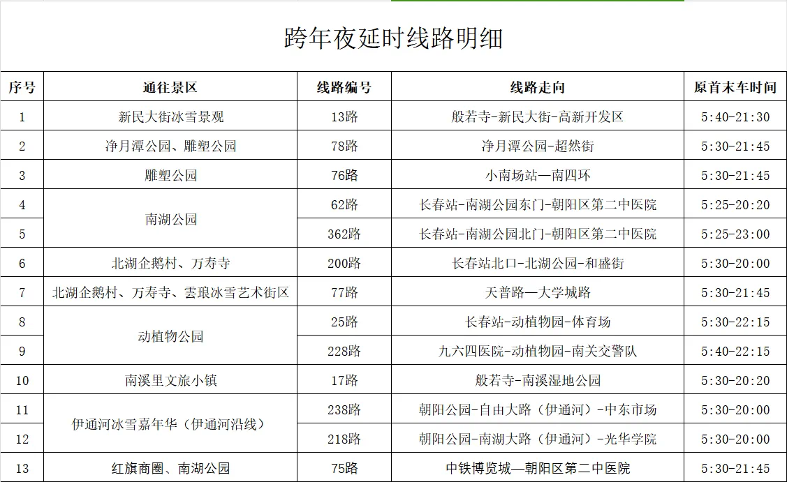 为方便广大市民和游客在2024—2025年跨年夜出行观展,12月31日,中国吉林网获悉,长春公交集团对13条常规公交线路进行延时调整,分站末车时间延迟到22点30分,请广大市民和游客提前做好出行规划,调整日期为2024年12月31日当日,具体调整如下表: