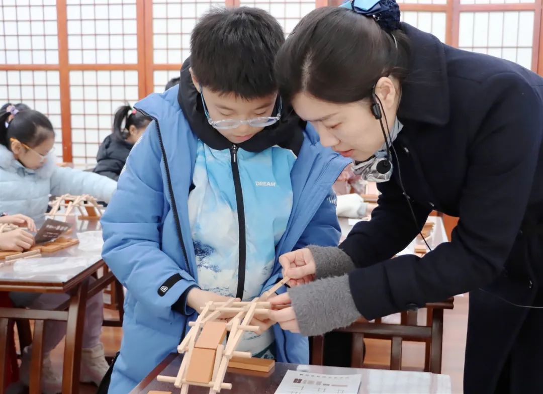 中国古代建筑屹立千年,静默不语,却仿佛蕴含着千言万语。每一块砖石、每一根木梁,都像是历史的见证者,记录着过去的风雨沧桑和人间烟火。在手工课程中,玉卓姐姐选择了原木材质,并充满寓教于乐的搭建体验——榫卯鲁班桥,让同学们亲手体验古代的建筑智慧。
