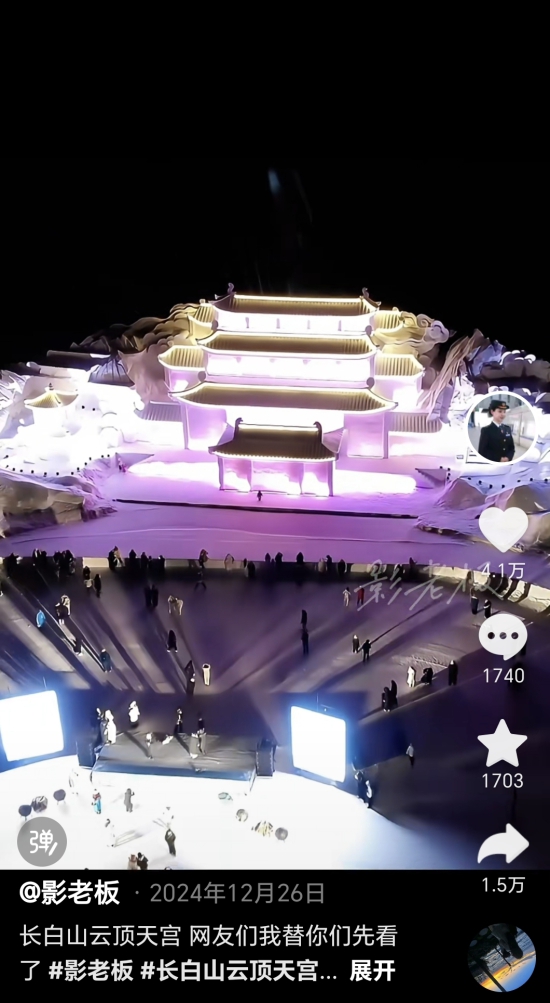 自项目启动伊始,便在网络上引发强烈反响。#长白山#云顶天宫#盗墓笔记 等相关话题在各大网络平台热度值急剧飙升,吸引着无数书迷与游客的目光。线上直播云监工的模式,更是让网友们跨越时空界限,与建设者们一同见证这座梦幻雪雕的诞生。云顶天宫本身就自带流量,相关视频在网络上广泛传播,未正式亮相时已成为热门话题。