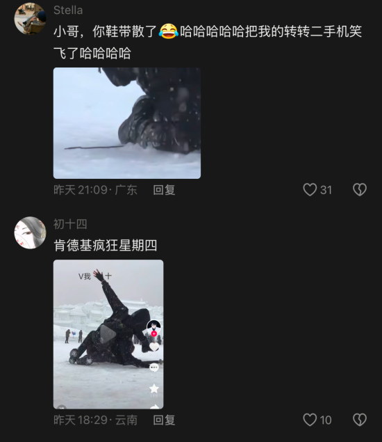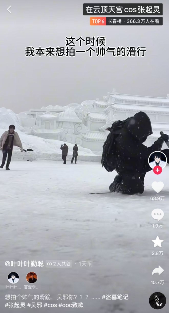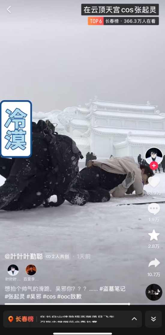 其中一位网友的视频在网络上迅速走红,视频中他前面帅气的cos造型与后面意外摔倒的场景形成强烈反差,收获大量点赞,登上热搜榜,进一步提升云顶天宫雪雕的热度。