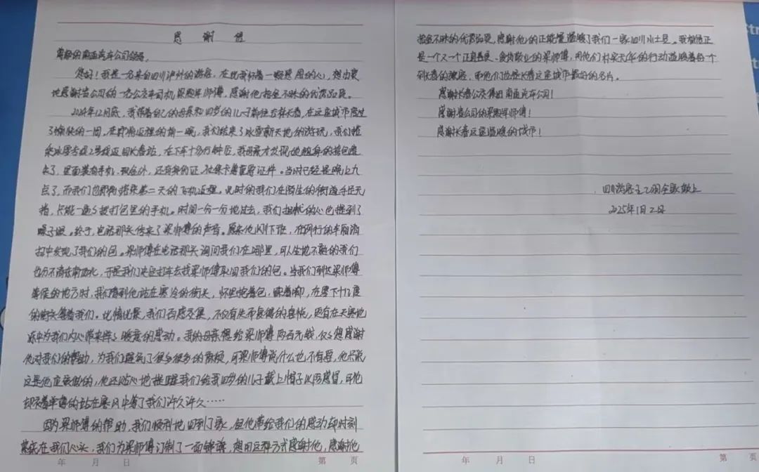 本以为是件小事的梁殿军并未将此事放在心上。但返回四川老家后的王女士每每回忆起这次经历,仍记忆犹新,心中满是感激,想要对那位不知姓名的热心公交车驾驶员表达感谢,她通过网络平台与冰雪2号线车队取得联系,并亲手写了一封感谢信,与定制的锦旗一并寄出。