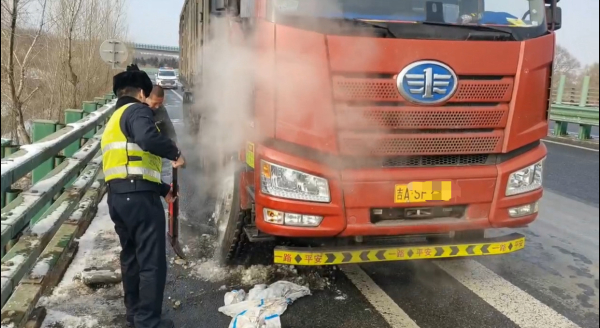 1月23日,省公安厅交通管理总队高速吉林支队的民警在日常巡逻中,敏锐地察觉到前方一辆大型货车右侧轮胎有黑烟冒出,情况十分危急。面对这一紧急情况,民警迅速反应,当即通过喊话器示意货车靠边停车,同时做好现场安全防护措施,避免其他车辆因视线受阻而发生碰撞。