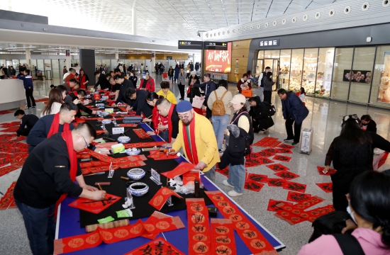 书法家们还根据旅客的个性化需求,现场创作独特的春联内容,旅客们纷纷驻足,争相接“福”迎“福”,南来北往的旅客手持“私人定制”款春联、福字打卡拍照,与亲朋好友分享旅途的喜悦,机场内充满着浓浓的年味儿。
