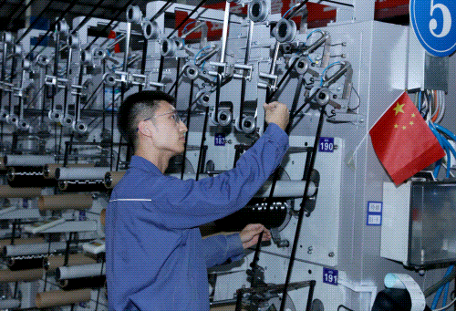 长丝十一车间的员工正在加紧生产细旦丝,产品年后即将发往印度,用于制作高端梭织面料;