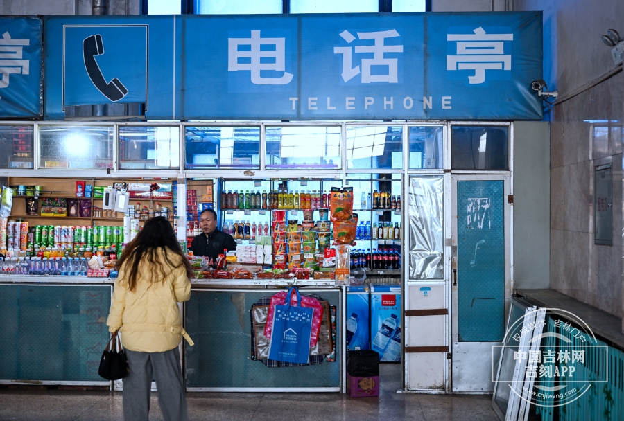 在通化站内一处售货亭内,老吕跟过往的旅客互动着。