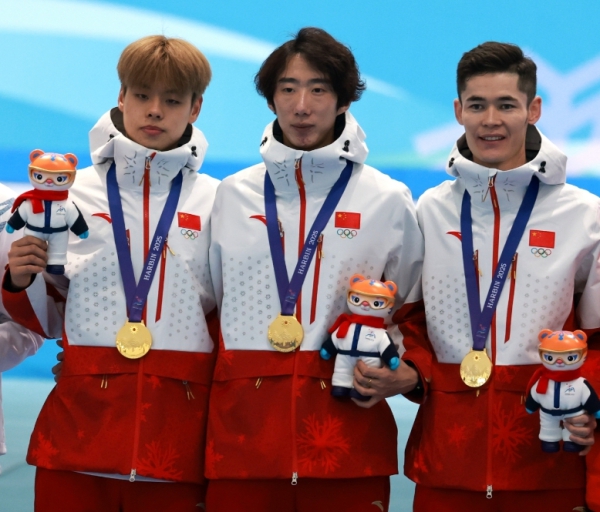 刘瀚彬与队友吴宇、哈那哈提·木哈买提在速度滑冰男子团体追逐赛中夺得金牌。