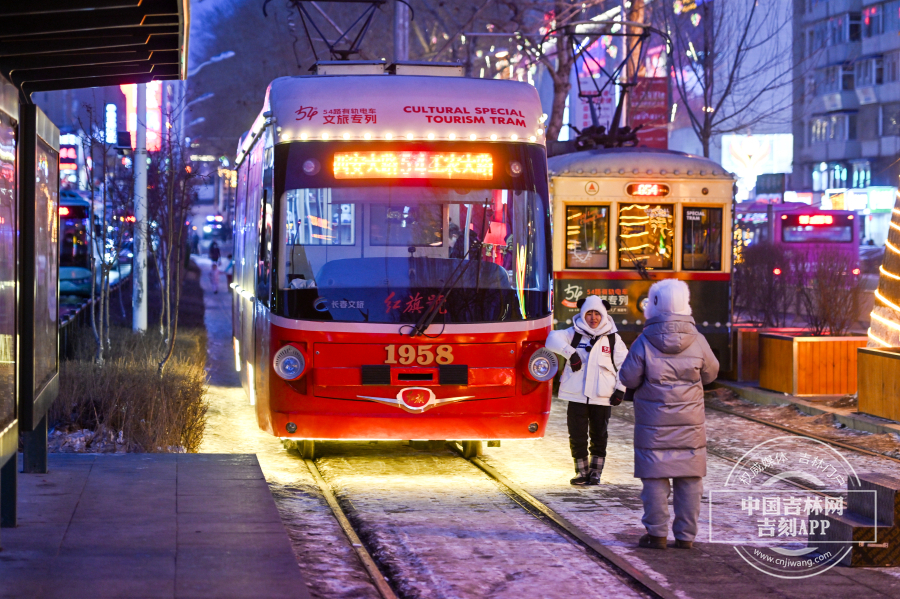 长春电影制片厂大门对面就是54路有轨电车的站点,不少市民来到红旗街一定会来这里打卡拍照。元宵节的夜晚也不例外,带着孩子的家长们不仅能在这里回忆起小时候的记忆,也能给孩子们讲述长春的历史。“小时候总坐54路,去娜奇美买东西,那时候觉得车可慢了,现在转眼人到中年,再看看54路,总能想起小时候。”市民李先生说,这两年54路文旅专列火了,李先生就带着孩子过来看看,也给孩子讲讲这些年长春的变化。