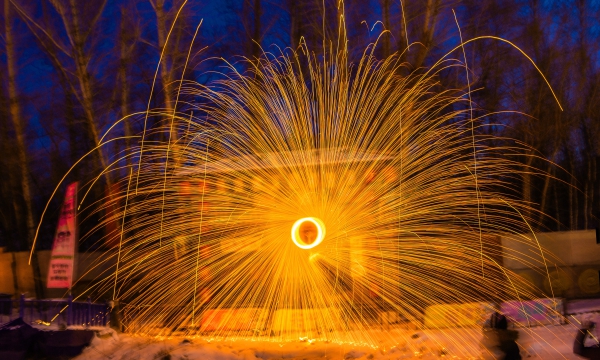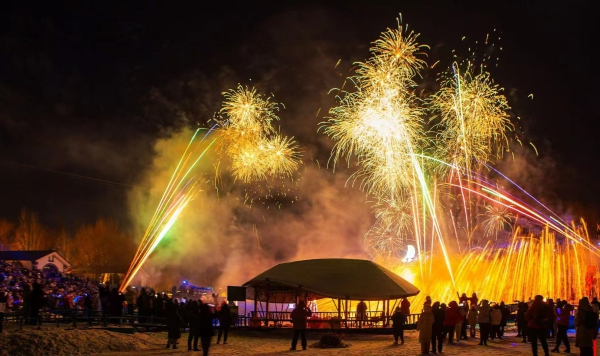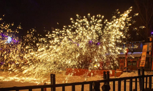 刹那间,斑斓画卷在眼前铺陈,一排排水母烟花点燃升空,一只只梦幻“水母”浮游天际,与周围的冰雪美景交相辉映,美不胜收。