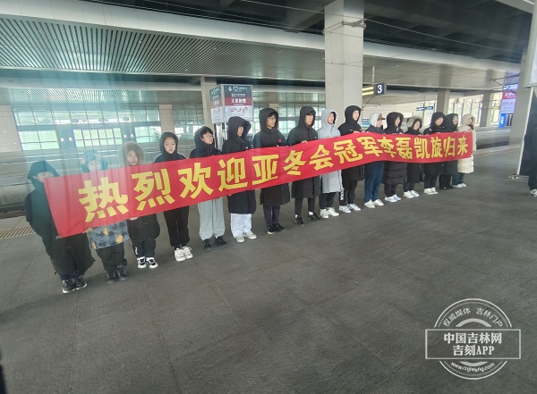 2月13日上午,长春西站接站口非常热闹,“热烈欢迎亚冬会冠军李磊凯旋归来!”的横幅十分醒目,长春市体育局机关相关人员及市冬季运动管理中心的运动员们近百人在车站翘首以盼这位家乡运动员回家。